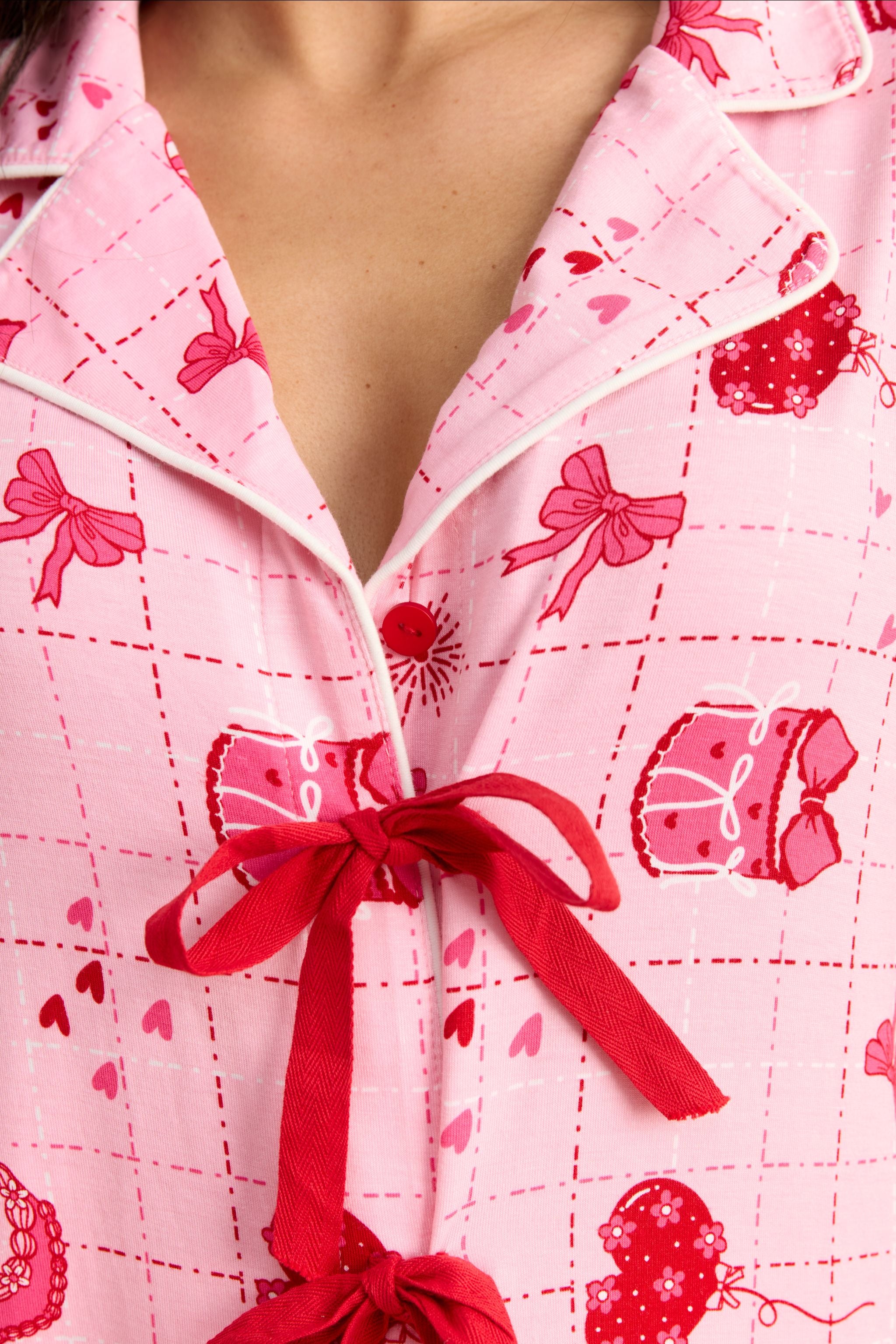 Celebrate in comfort with our Celebration PJ Set. Crafted from a luxuriously soft bamboo blend, this dreamy pink set features a button down top and tie up bows that are both super cute and functional. The limited edition print showcases vintage cakes, disco balls, bows, and balloons, designed to make every night feel like a celebration!